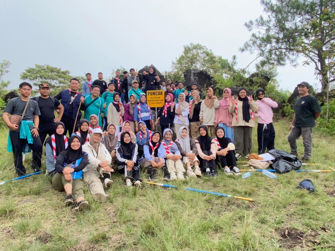 Puncak dari seluruh kegiatan tiba di pagi hari yang berkabut, ditandai dengan pendakian menuju Puncak Puthuk Kenthongan. Setiap langkah menapaki jalur pendakian adalah ujian kesabaran dan kerja sama tim. Dan akhirnya, dalam bingkai foto ini, terlihat jelas wajah-wajah bangga yang berhasil menaklukkan ketinggian. Papan nama “PUNCAK Kenthongan” menjadi saksi bisu atas keberhasilan mereka.